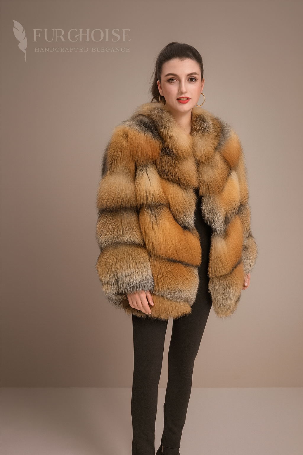 The visual impact of this coat stems from its voluminous fox fur coat construction. We utilize premium Red Fox pelts, known for their plush density and long guard hairs, skillfully arranged in bold, horizontal bands of color. The contrasting stripes—typically Black and Gold/Tan Fox Fur—are expertly matched and stitched to enhance the coat's luxurious fullness and texture. This technique ensures that the coat is not only fashion-forward but also exceptionally warm, functioning as both a fashion accessory and a reliable piece of winter warm outerwear.